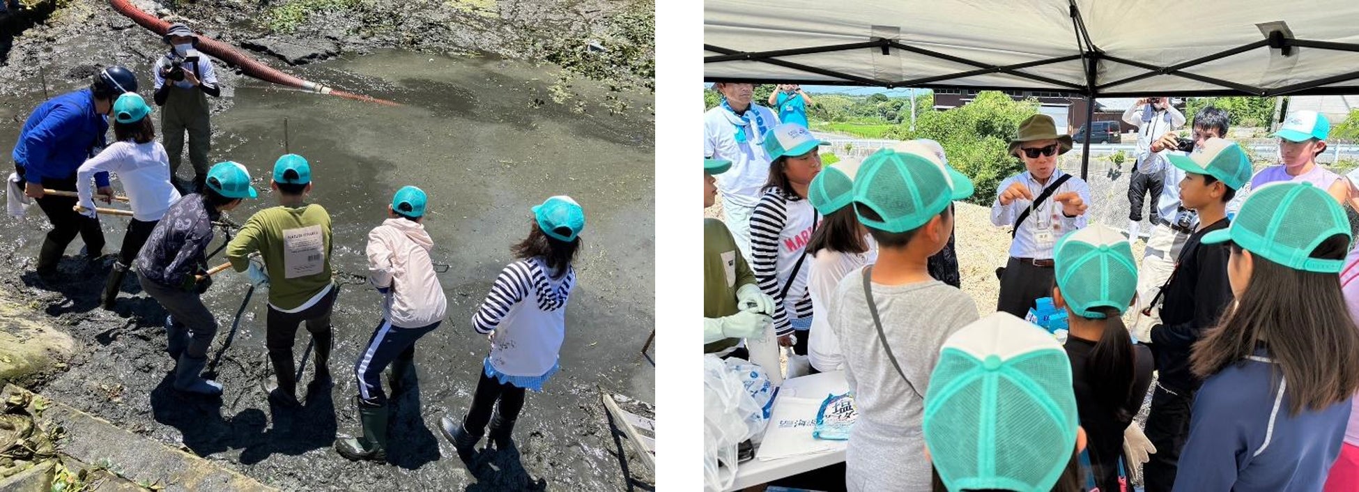 普段からお仕事でかいぼりに携わる講師 福井 啓太先生(株式会社成田専務取締役)より、かいぼりを行う上での課題や、硬い泥を掻いて掘り(かいぼりの由来)トロトロになるまでかくはんすることで、ため池の中にいれた管で泥水を吸い上げることができ、川に排出すると河口やその先の海まで流れやすくなるという工程などを教えて頂きました。また、ため池の泥水についても水質調査を実施。初日に採取した明石浦漁港の表層の海水、底泥水、明石川の水に含まれているリン、窒素の濃度と比較を行いました。結果、ため池には栄養塩が豊富に含まれていること、そして海の底泥に堆積してしまっているので、かいぼりや海底耕耘(かいていこううん)などの取り組みが必要であることも分かりました。