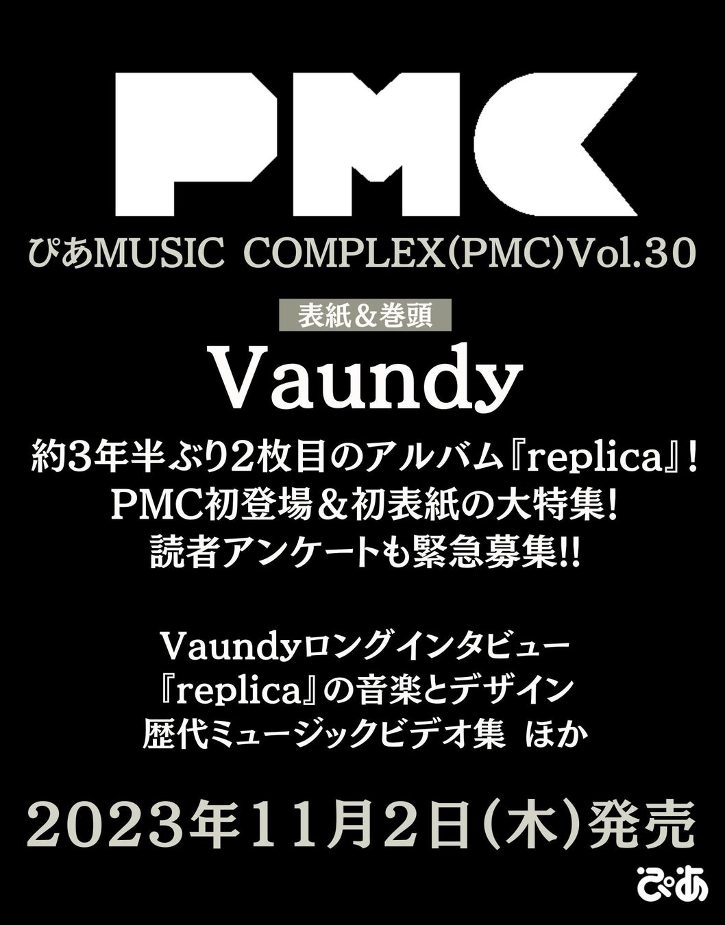 11月2日(木)に発売される『ぴあMUSIC COMPLEX (PMC) Vol.30』にてVaundyが初登場&初表紙を飾ることが決定。特集では、3年半ぶり、全35曲を収録するニューアルバム『replica』(11月15日発売)についてのロングインタビューはもちろん、アートワークも自らプロデュースするVaundyに、「音楽×アートの関係」の視点からも、たっぷり語ってもらいます。