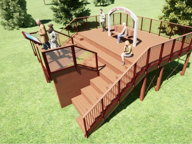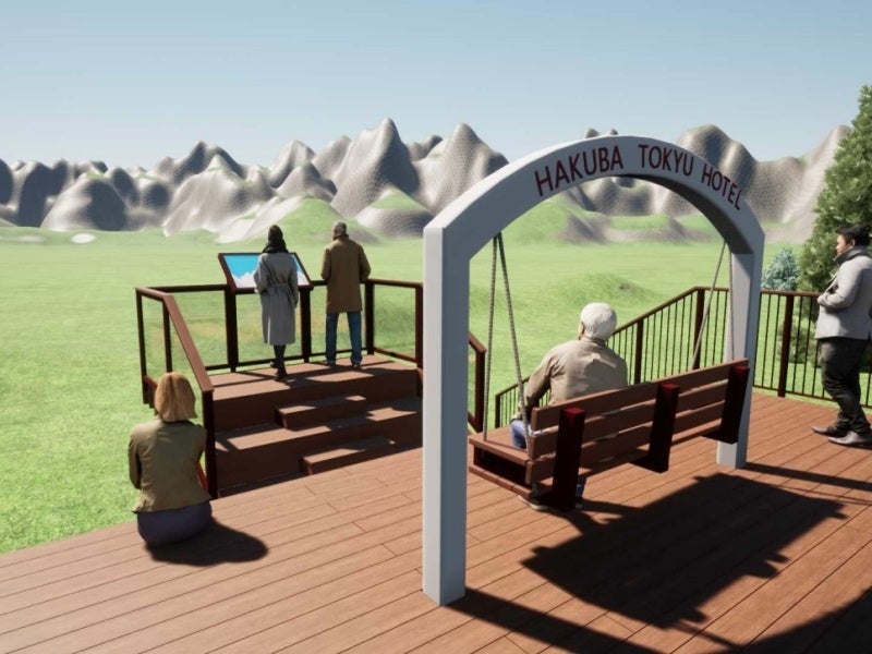 高さ約2mの展望デッキからは北アルプス(白馬三山)を一望でき、山を望みながらのんびりできるブランコや階段ベンチ、記念写真用のホテルロゴ入りアーチなどを設置する予定です。