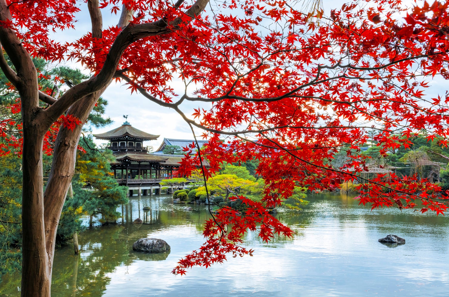 琵琶湖を模した平安神宮神苑の栖鳳(せいほう)池。水面には周囲の木々や青空、雲がダイナミックに映り込み、無限の広がりを見せる。