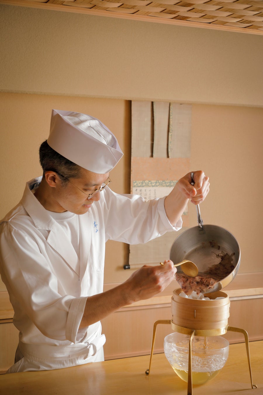 日本料理の「木山」では、お椀を出す際に客の前で鰹節を削り出汁をひく。「季節によって出汁の出方は違うので、水と対話し分量なども調整して出汁をひきます」という店主の木山義朗さん。