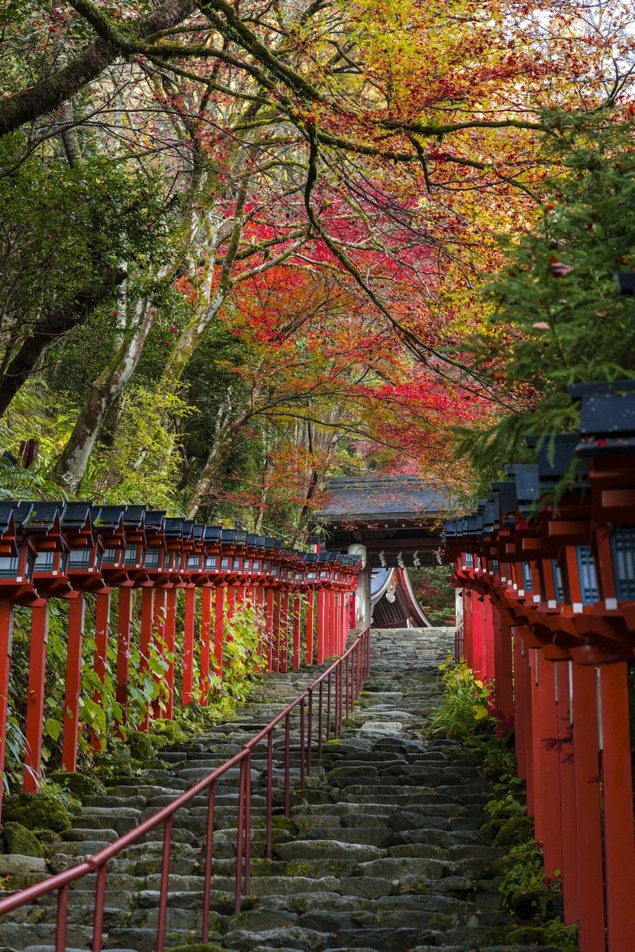 朱色の灯籠が並ぶ貴船神社本宮への表参道。豊かな水源を守る貴船神社は、水神を祀る全国500社の総本宮でもある。