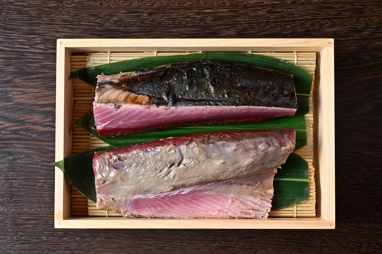 第3回の鮨種は「鯖と鰹」。特注の炉を使い、藁で燻してしばらく寝かせた鰹。淡く塩をし、スライスして3枚付けで握る鯖。いずれも、シャリとの一体感が楽しめます。