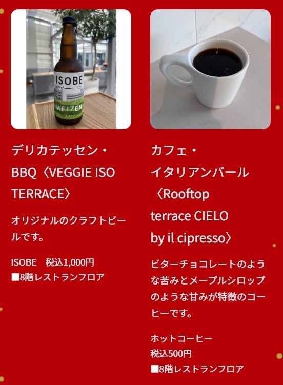 さらに6つのショップではテイクアウトのフードメニューもご用意しています。華やかさのなかに京都のエッセンスを感じさせるクリスマスツリーのそばで、特別な時間をお過ごしください。