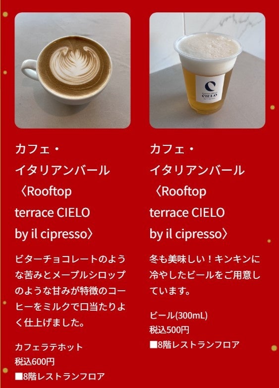 ツリーを眺めながら8階レストラン〈ルーフトップテラス チェーロ バイ イル チプレッソ〉であたたかいラテや軽食を、また〈ベジ イソ テラス〉ではバーベキューを楽しむこともできます。