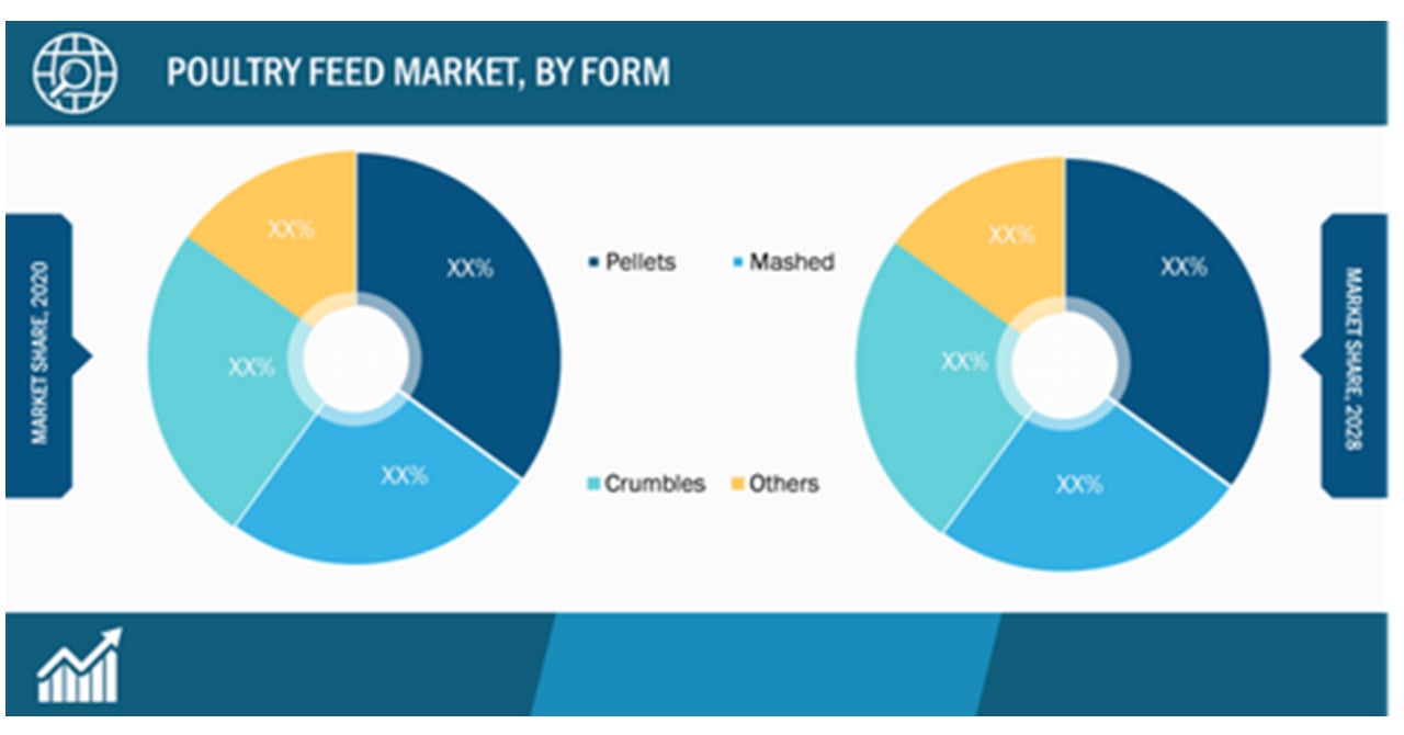 家禽の種類に基づき、世界の家禽飼料市場はレイヤー、ブロイラー、七面鳥、その他に区分される。ブロイラー部門は、2020年の市場で最大のシェアを占めています。ブロイラーは食肉用に飼育される鶏で、急速な成長をサポートするために高タンパク質の飼料が与えられています。ブロイラー用家禽飼料には、マッシュ、ペレット、クランブルなど、さまざまな形態があります。インドはブロイラー産業において配合飼料の需要が高まっており、最大のブロイラー生産国の1つです。ブロイラー生産の増加は、予測期間中、ブロイラー用家禽用飼料の需要を引き続き押し上げると思われます。