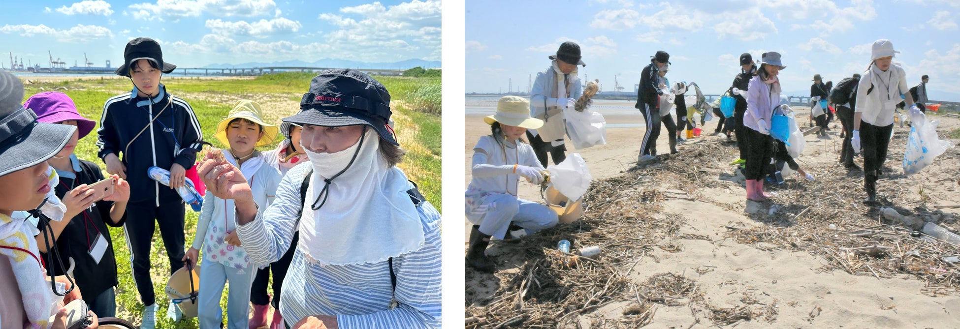 三重県三重郡川越町の朝明川の河口に広がる高松干潟。子どもたちは川沿いの堤防に立って、川が注ぐ海を見渡した後、干潮で現れた海の底へ。干潟の環境を守る活動をしている「高松干潟を守ろう会」の水谷いずみ会長らの案内で歩き、生き物の観察をしました。一歩一歩進むごとに見つかるカニや貝。カニのすばしっこさに初めは驚いていた子どもたちも、目が慣れてくると次々と捕まえて仲間で見せ合って喜んでいました。一方、砂浜には、その生き物の数を上回るのではと感じるほどのごみが散乱。子どもたちはペットボトル、缶などを拾いながら、サツキマスの遡上の通り道となる伊勢湾沿岸域の自然の豊かさとともに、それを人がおびやかしている現状を目の当たりにしました。水谷さんは、海にすむ生物だけでなく、海岸に自生して砂浜の砂が流れ出すのを防いでいる海浜植物も紹介し、生物の多様性によって一帯の環境が保たれていることも教えてくれました。