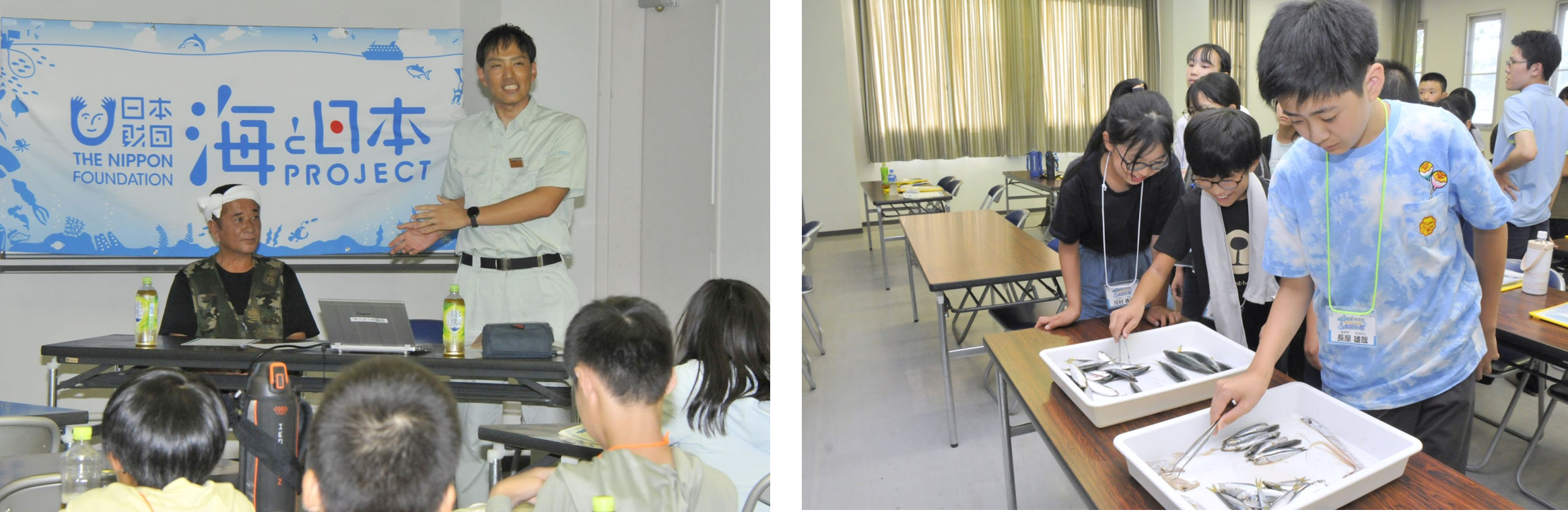 今泉哲さんと愛知県ぱっち網漁業者組合の磯部治男組合長から、サツキマスのえさとなるイカナゴについて話を聞きました。愛知県の漁獲量は全国有数で、加工品は「ちりめん」「じゃこ」などとして親しまれてきましたが、近年は獲れず、9年間禁漁が続いています。今泉さんは減少の理由について、イカナゴは冷たい水を好む魚であるものの海水温が上がっていることや、他の魚に食べられることが増えたことなどを挙げ、サツキマスが育つ伊勢湾の今と昔の変化を説明しました。また、現在はイカナゴに代わり行っているカタクチイワシの漁では、研究者と漁師が連携して漁獲量を調整し、資源管理に努めていることを紹介し、子どもたちが真剣に耳を傾けていました。