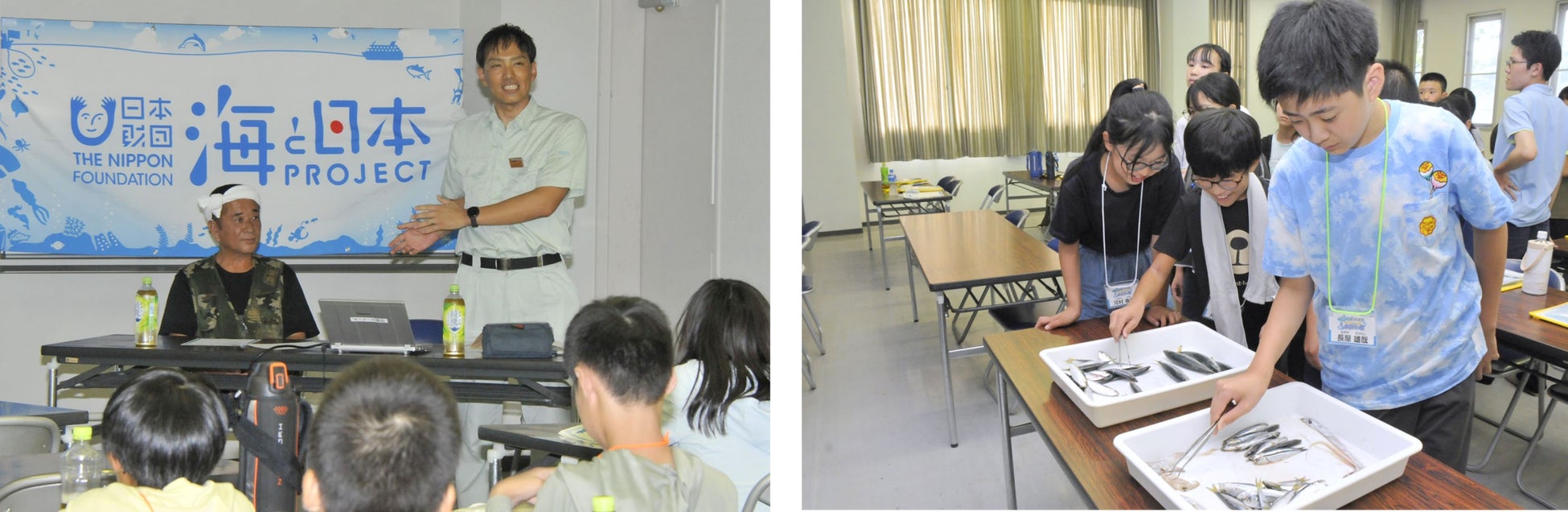 会場には、地元で獲れた多様な小魚も展示され、子どもたちはにおいをかいだり、触ったりして、調理される前の生の魚の状態を興味深そうに学んでいました。