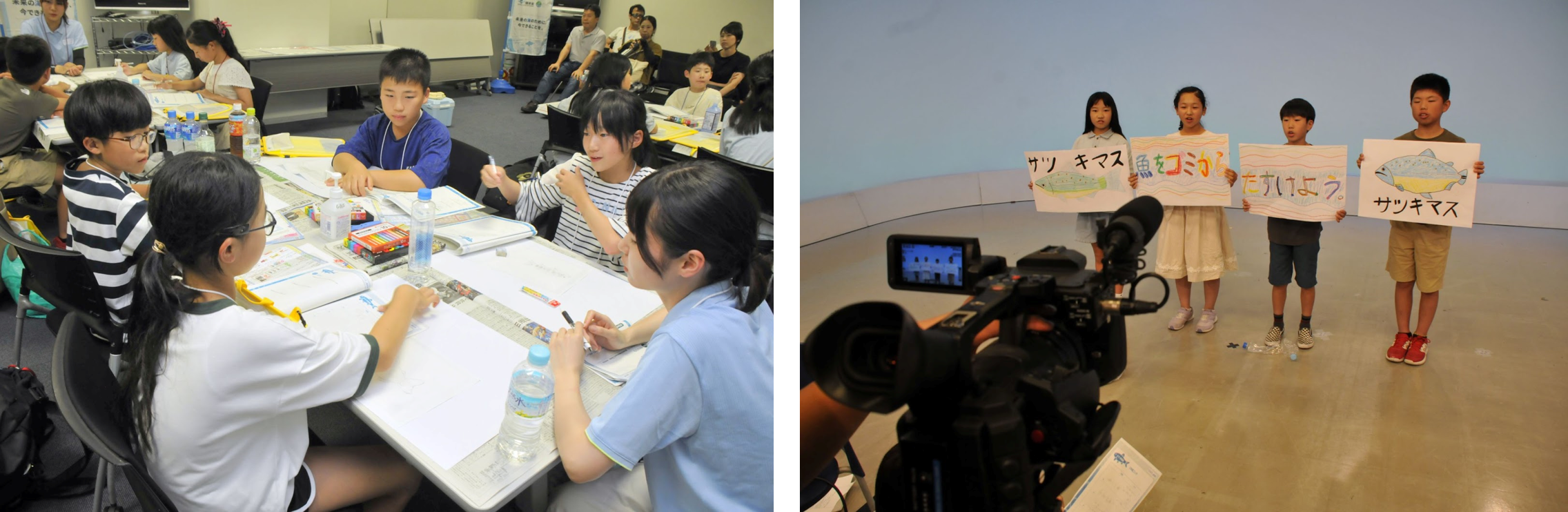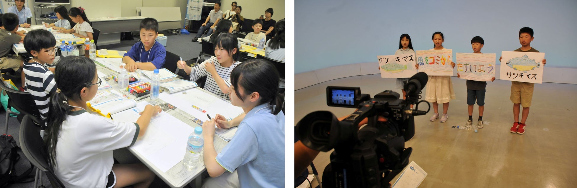 2日間の学びのまとめは、岐阜市橋本町の岐阜放送本社でのCM制作。子どもたちはグループごとに、海の課題解決に向けたアクションを訴えるCMを考えて出演しました。