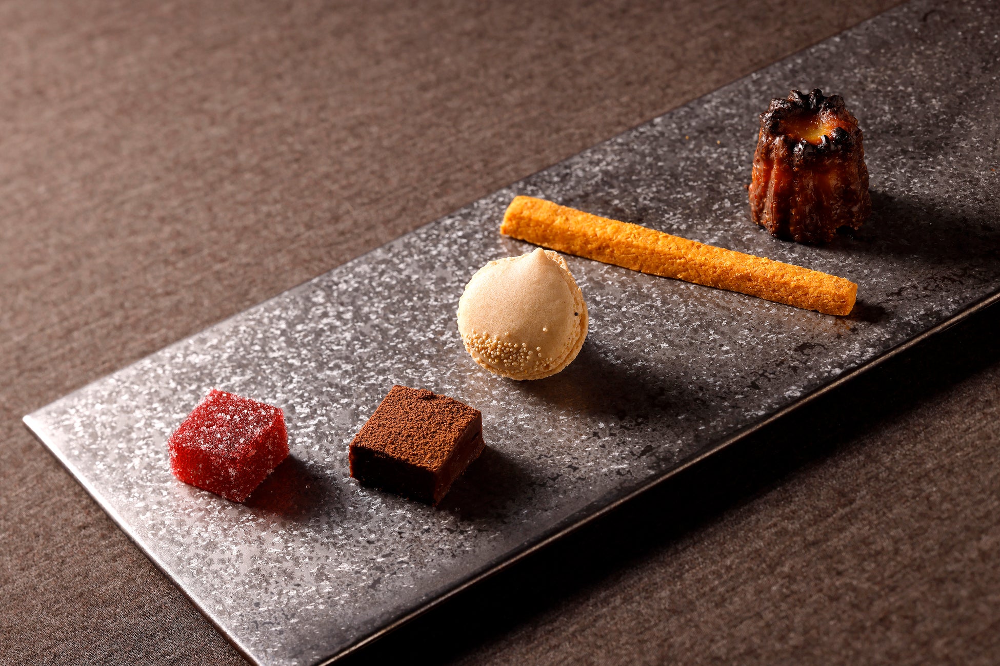 栗の形を模したマカロンなど5種の盛り合わせです。