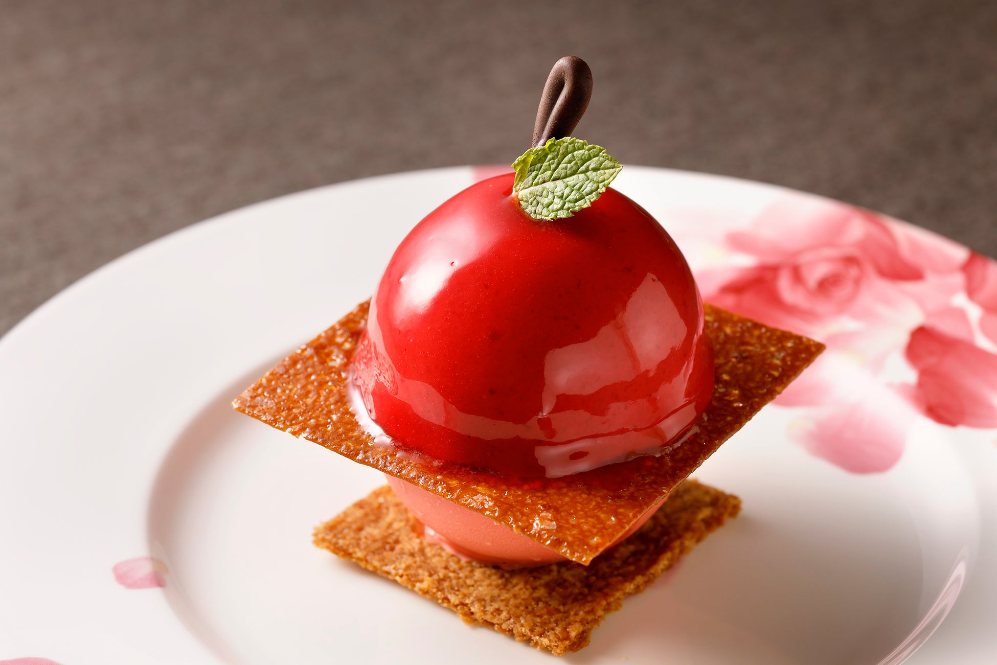 旬を迎えたりんごをモチーフにした見た目にも心躍る一品。上部はつややかに仕上げたりんごのシャーベット。下部はくちどけの良いプラリネクリームの中にりんごのコンフィを閉じ込めました。控えめな甘さに温度や食感の違いが調和するバランスの良いメインディッシュに仕上げています。