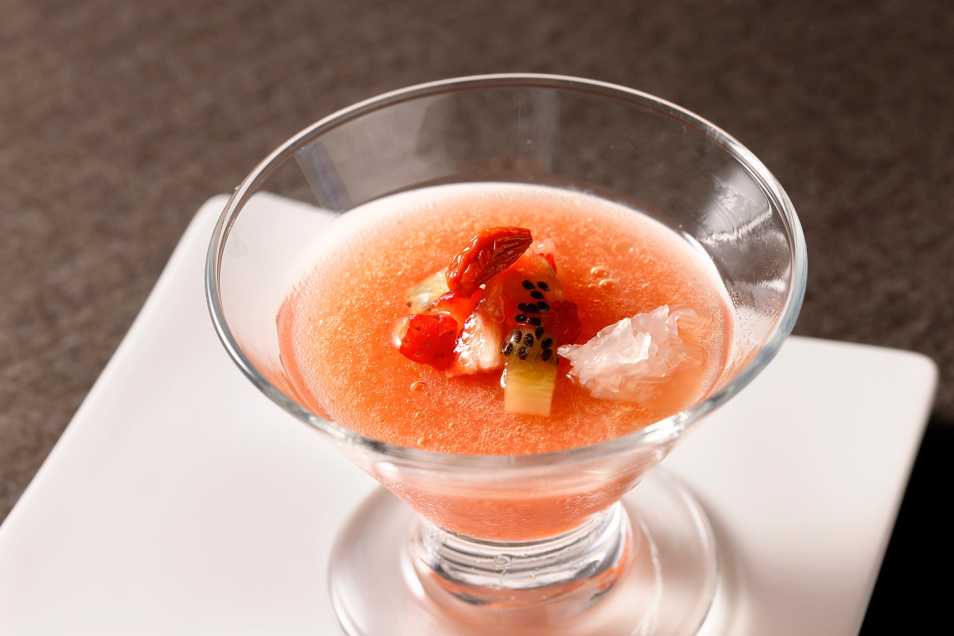 アニスのリキュールで風味を付けた甘く爽やかな香りをまとった苺のスープです。