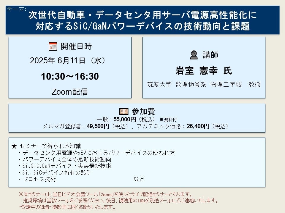 先端技術情報や市場情報を提供している(株)シーエムシー・リサーチ(千代田区神田錦町: https://cmcre.com/ )では、 各種材料・化学品などの市場動向・技術動向のセミナーや書籍発行を行っておりますが、 このたび「次世代自動車・データセンタ用サーバ電源高性能化に対応するSiC/GaNパワーデバイスの技術動向と課題」と題するセミナーを、 講師に岩室 憲幸 氏(筑波大学 数理物質系 物理工学域 教授)をお迎えし、2025年6月11日(水)13:30より、 ZOOMを利用したライブ配信で開催いたします。 受講料は、 一般:55,000円(税込)、 弊社メルマガ会員:49,500円(税込)、 アカデミック価格は26,400円(税込)となっております(資料付)。