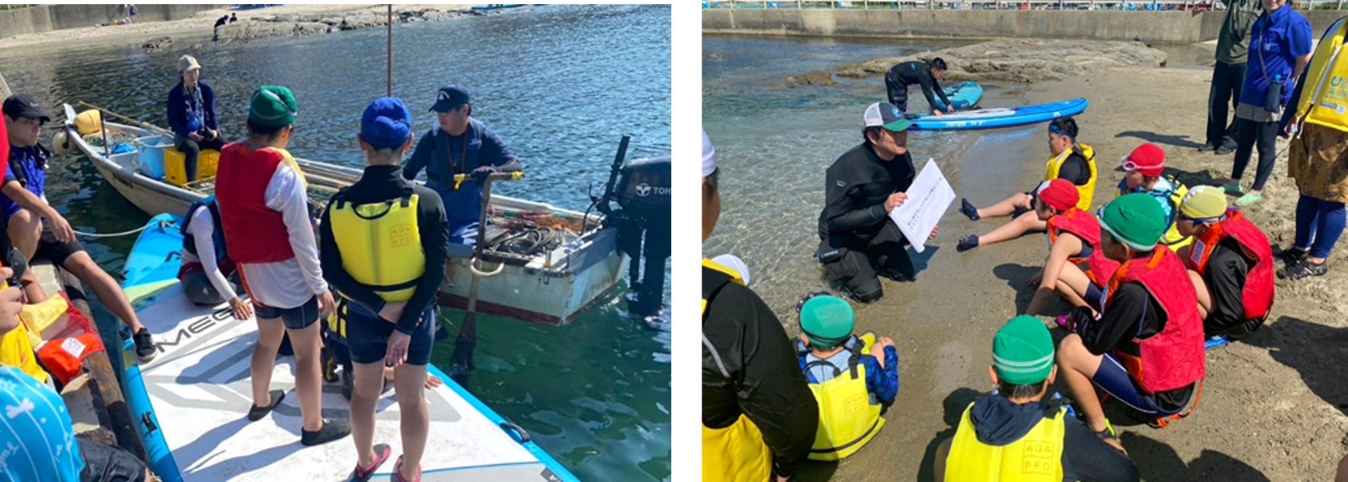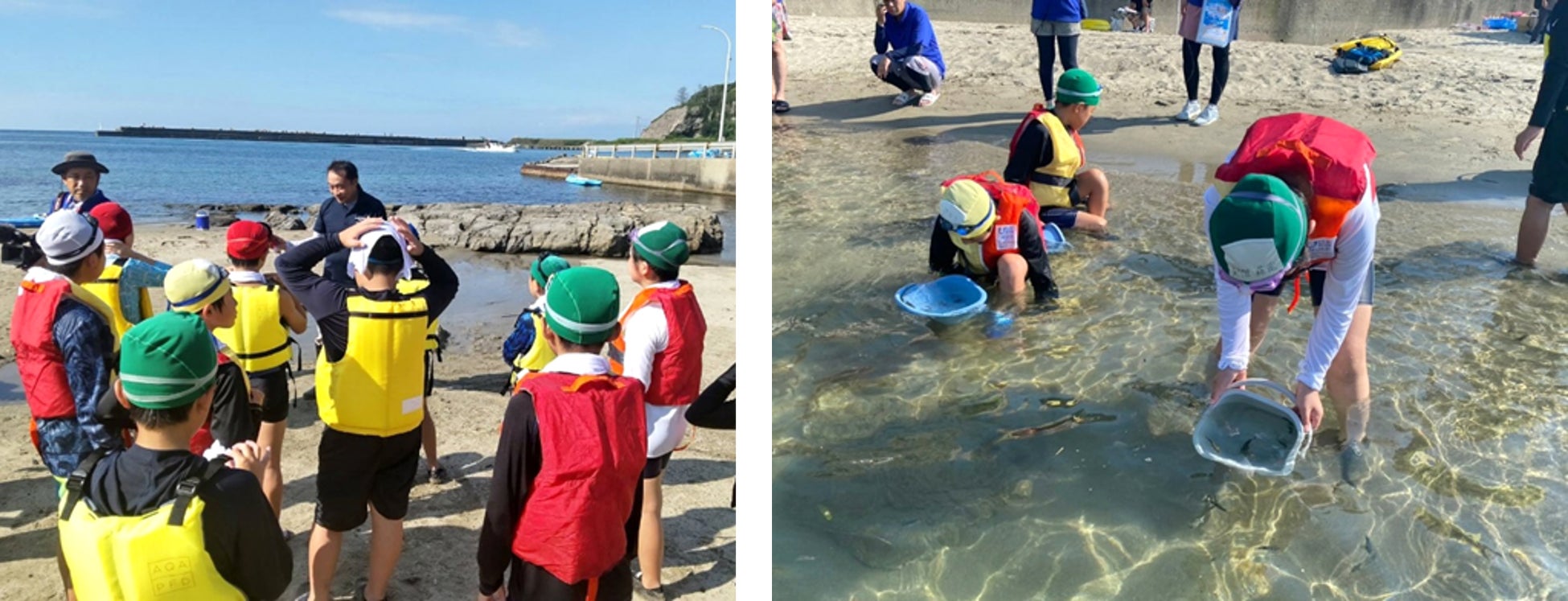 加茂水産高校ダイビング部の補助と渚の交番カモンマーレと連携して、シュノーケリング体験を行いました。海洋環境の変化によって起こっているビーチ付近での影響や、ダイビング部の学生が学んでいること、沖の海との違いと実際に海を体験。また、班のリーダーを水産高校生とし、実際に海で学んでいる学生からの学びの機会を設け、子どもたちが放流した魚の観察など、海を体感することで学びが深まりました。
