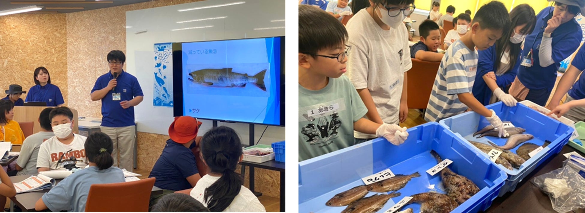 海洋環境の変化による海の魚の影響を栽培漁業センターの余語氏から学びました。食文化として守られているクロダイと、海洋環境変化に伴い新しいブランド化を目指しているトラフグの放流体験を行い、命の大切さ、循環を体感しました。