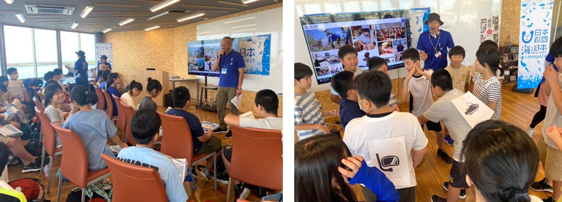 県土面積の約7割が森林である山形県は、沿岸部と内陸部では海に対する親しみ深さや理解度に大きな差があります。今年も県内の様々な地域から30名の子どもたちが集結し、山形の海を学び・楽しみ・考える「やまがた海洋塾」が始まりました。今回は山形大学の教員と、山形大学教育学部で海洋関係を研究している大学院生も参加し、子どもたちと同じ体験をしてもらうことで県内における海洋教育の更なる普及と発展をともに考えました。入塾式では塾長を務める山形県立加茂水産高等学校元校長の佐藤淳氏より、庄内浜の文化や歴史、今回の海洋塾の目標が説明されました。