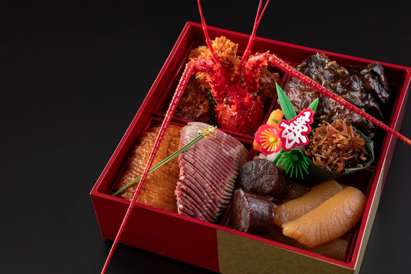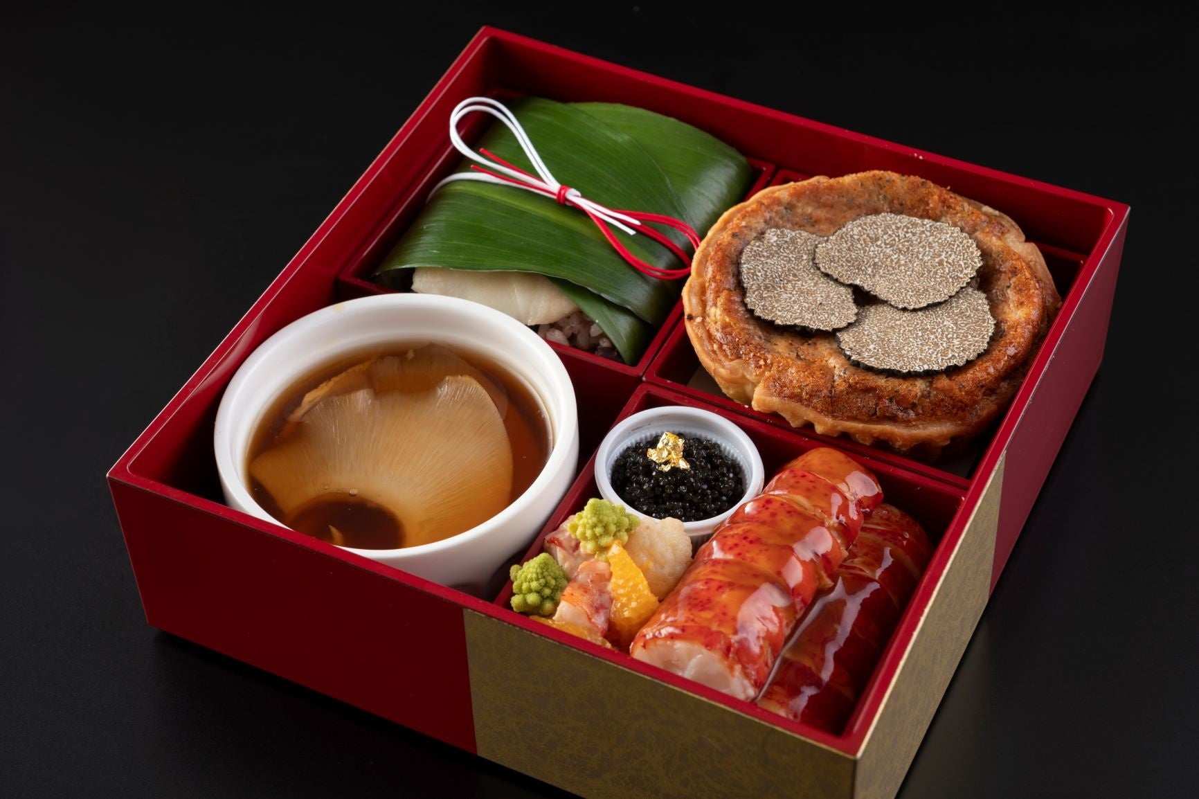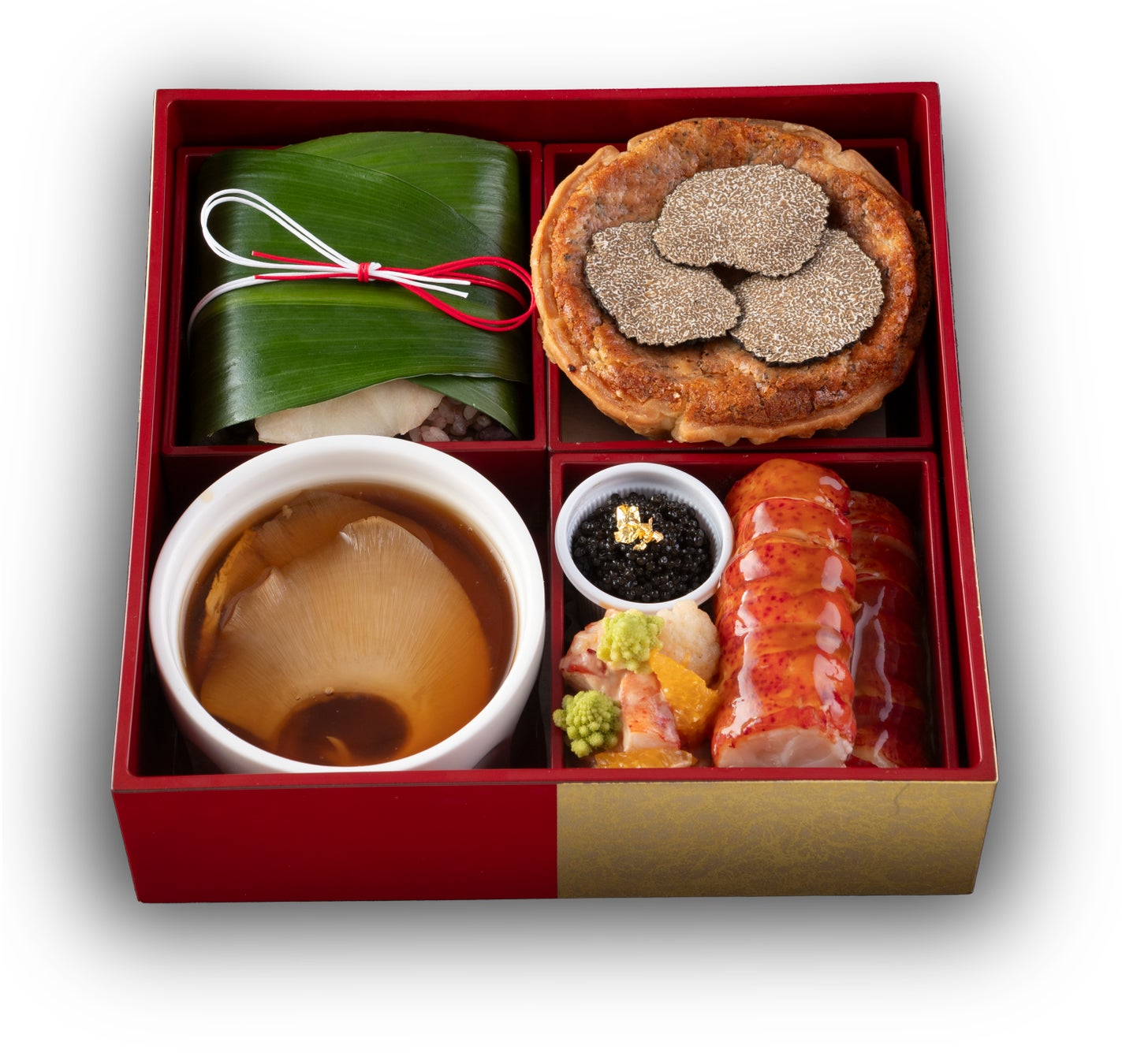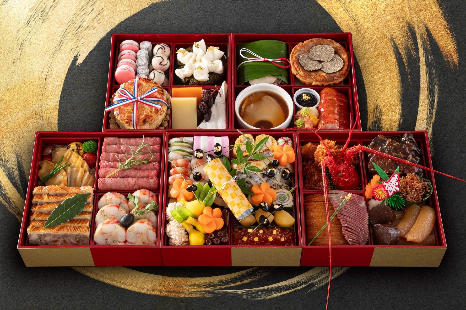 昨年ご好評をいただいた、セルリアンタワー東急ホテルの「お祝い重」。今年は一部のメニューをリニューアルし、新年を祝うにふさわしい華やかな内容で、15台限定にて販売いたします。トリュフ、キャビアをはじめ、伊勢海老、フカヒレ、鮑、オマール海老などの豪華な食材を贅沢な五段重ねでご用意いたします。監修したのは、日本におけるフランス料理界を牽引してきた総料理長 福田順彦。ホテルの総力を結集した45品にも及ぶ「和・洋・中・スイーツ」を、食材の選定から調理法、味付け、盛り付けまで、至高の調和と美しさを突き詰め、完成させました。