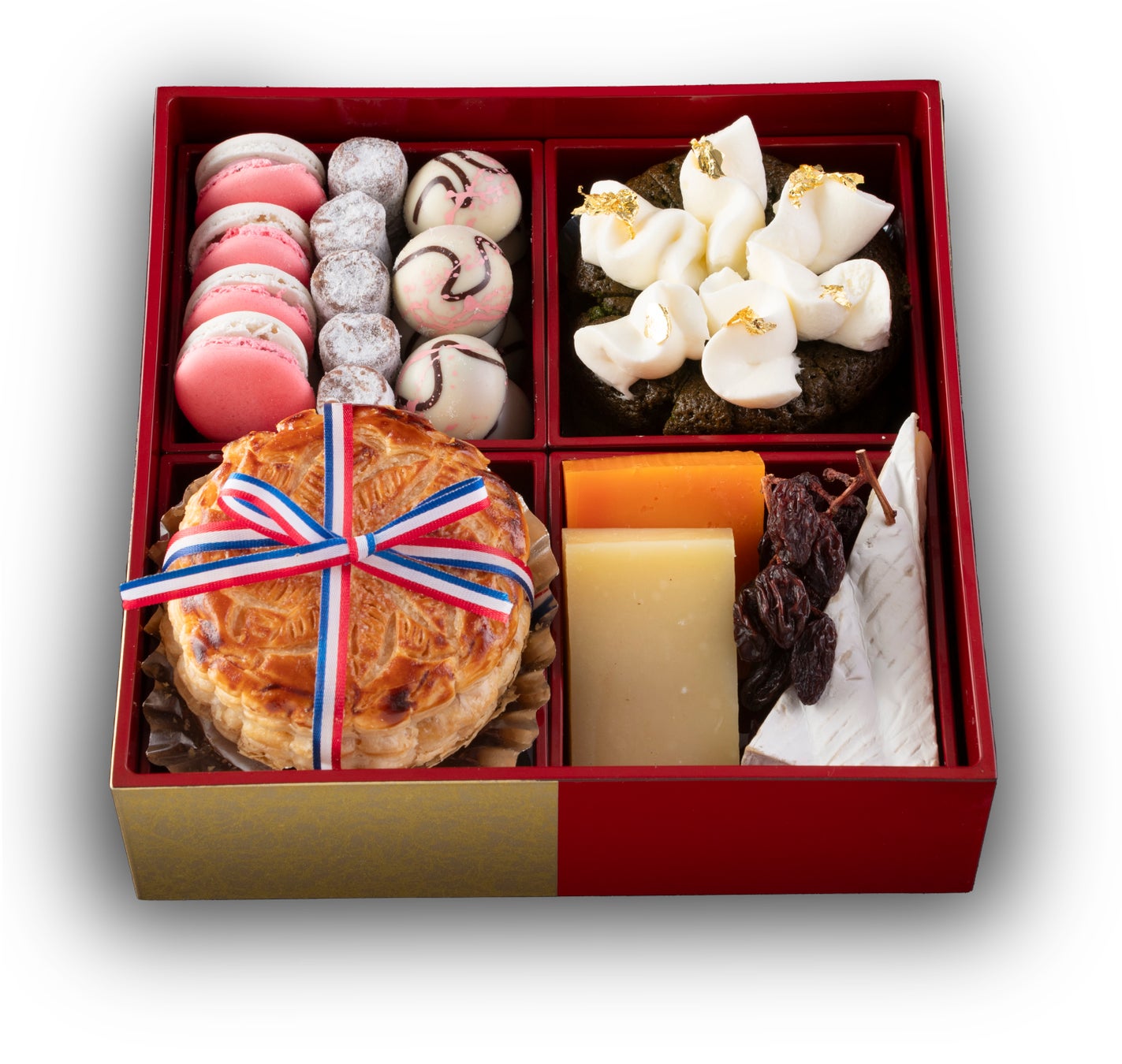 与の重は、製菓・製パン部門を束ねる三沢徳明と若手筆頭の古澤透が丹精込めて仕込んだ自慢のスイーツが並びます。さらにその下には、和洋中スイーツ、各シェフからの贈り物を「四合わせ(しあわせ)=幸せ」とした伍の重が控えます。