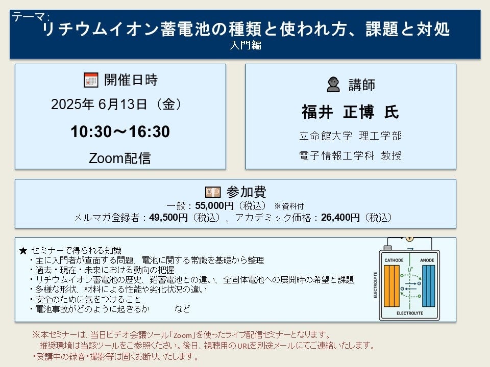 先端技術情報や市場情報を提供している(株)シーエムシー・リサーチ(千代田区神田錦町: https://cmcre.com/ )では、 各種材料・化学品などの市場動向・技術動向のセミナーや書籍発行を行っておりますが、 このたび「リチウムイオン蓄電池の種類と使われ方、課題と対処 入門編」と題するセミナーを、 講師に福井 正博 氏(立命館大学 理工学部 電子情報工学科 教授)をお迎えし、2025年6月13日(金)13:30より、 ZOOMを利用したライブ配信で開催いたします。 受講料は、 一般:55,000円(税込)、 弊社メルマガ会員:49,500円(税込)、 アカデミック価格は26,400円(税込)となっております(資料付)。