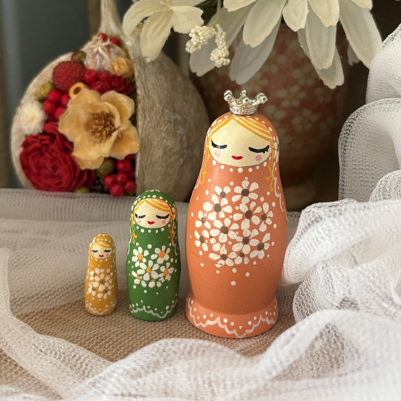 ロシアから仕入れた白木のマトリョーシカにオリジナルデザイン・彩色を施した、カラフルで可愛い作品が登場。