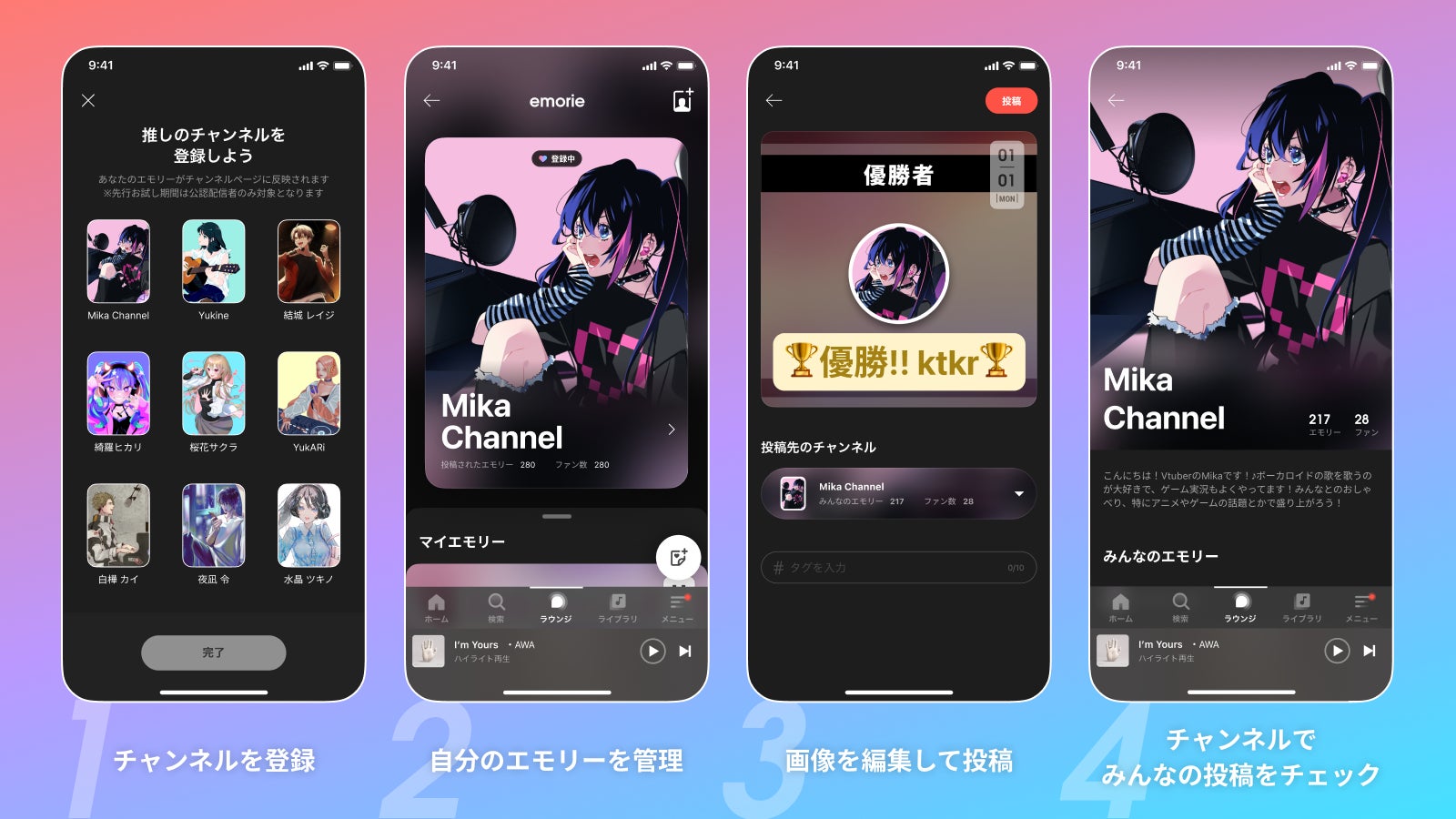 なお、『emorie』のクリエイターチャンネルは、AWAラウンジ公認配信者と、開設申請フォームより申請を行い審査を通過したクリエイターにのみ開設しておりますが、今後誰もが自由に開設できるように拡大する予定です。