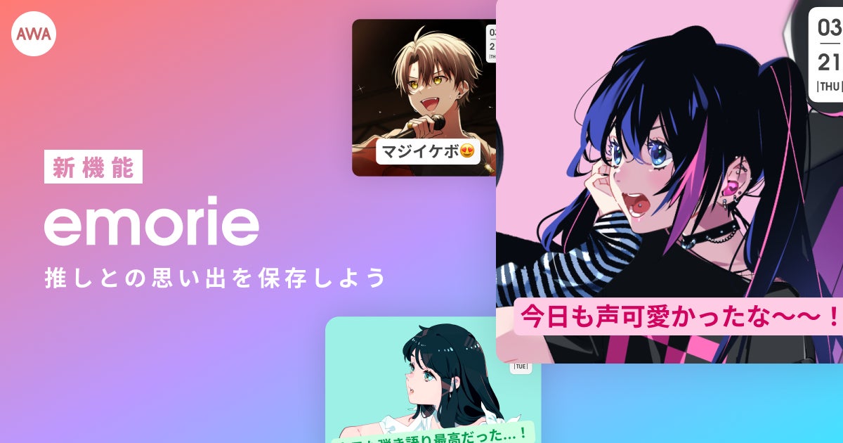 AWA株式会社(本社:東京都港区、代表取締役CEO:冨樫晃己)が運営する、サブスクリプション型(定額制)音楽ストリーミングサービス「AWA(アワ)」は、2024年6月28日(金)にクリエイターとファンの特別な瞬間を共有する新機能『emorie(エモリー)』をiOS向けにリリースし、既に先行リリースしているAndroid向けと合わせて、スマートフォン向けアプリにて提供を開始しました。また、『emorie』のリリースを記念した『推しへの愛を届けようキャンペーン』も開催いたします。