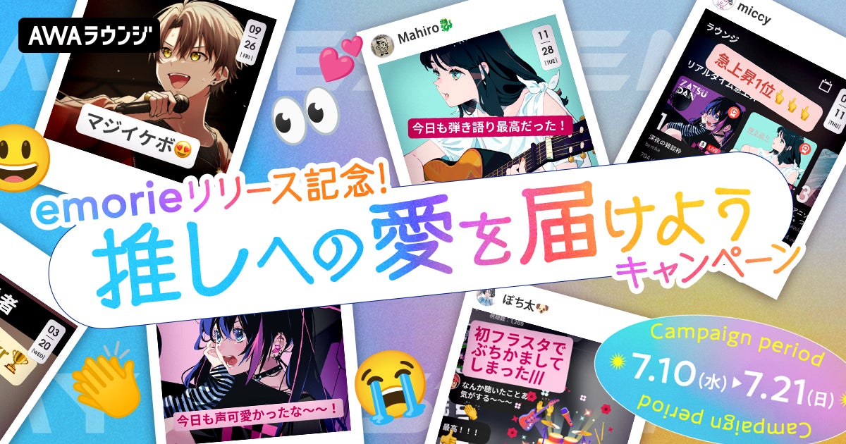 さらに、同機能のリリースを記念して、『推しへの愛を届けようキャンペーン』を実施いたします。本キャンペーンは、2024年7月10日(水)〜2024年7月21日(日)の期間中に、AWAラウンジにて配信しているクリエイターに対して『emorie』にて投稿されたファンアートおよび推し画像を審査のもと表彰するもので、どなたでも無料でご参加いただけます。