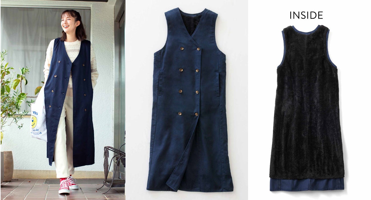 トレンチコートのようなストレートシルエットの裏ボアのロングベストです。らくな着心地で、「家着とお出かけ服を着分けない」アイテムです。