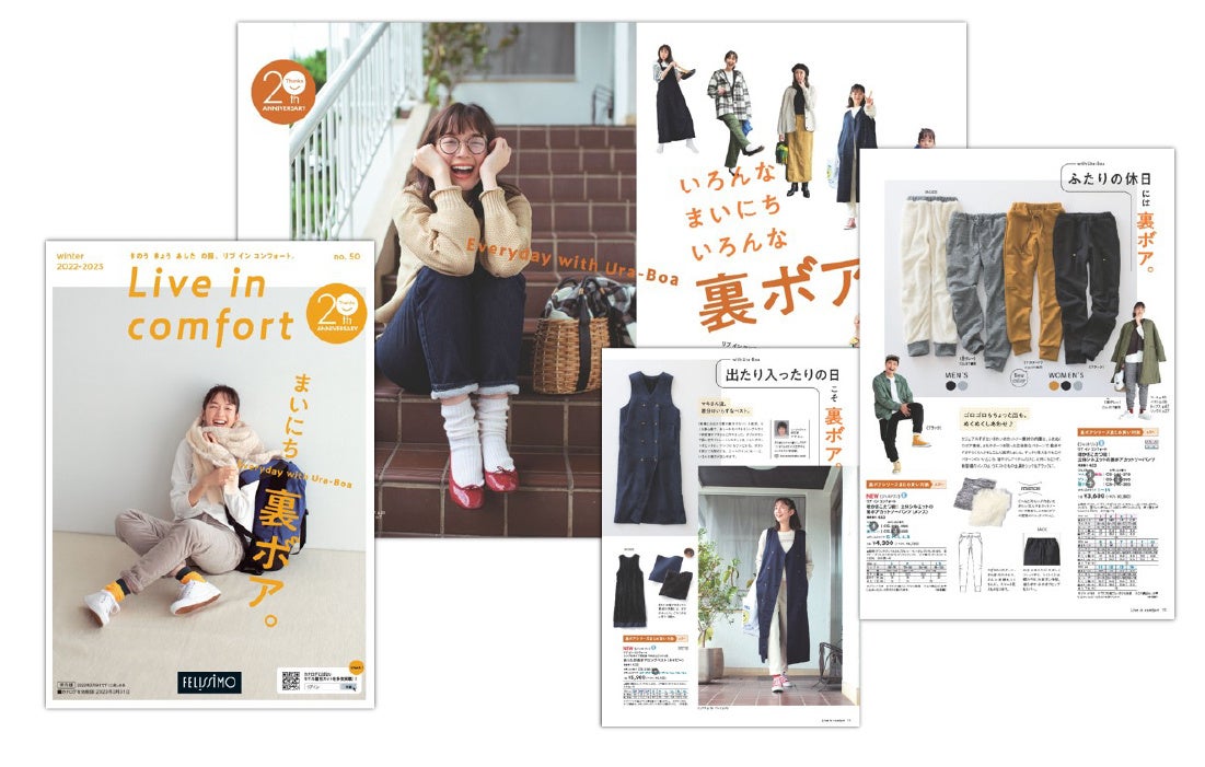 フェリシモ「Live in comfort」の大人気シリーズ裏ボアパンツにメンズアイテムと秋冬の新色が登場、もう中学生さんと佐藤栞里ちゃんのインタビューも掲載