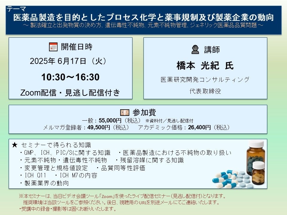 先端技術情報や市場情報を提供している(株)シーエムシー・リサーチ(千代田区神田錦町: https://cmcre.com/ )では、 各種材料・化学品などの市場動向・技術動向のセミナーや書籍発行を行っておりますが、 このたび「医薬品製造における不純物の取り扱いと当局への対応の重要ポイント~ 製法確立と出発物質の決め方、遺伝毒性不純物、元素不純物管理、ジェネリック医薬品品質問題 ~」と題するセミナーを、 講師に橋本 光紀 氏 (医薬研究開発コンサルティング 代表取締役)をお迎えし、2025年6月17日(火)10:30より、 ZOOMを利用したライブ配信(見逃し配信付き)で開催いたします。 受講料は、 一般:55,000円(税込)、 弊社メルマガ会員:49,500円(税込)、 アカデミック価格は26,400円(税込)となっております(資料付)。