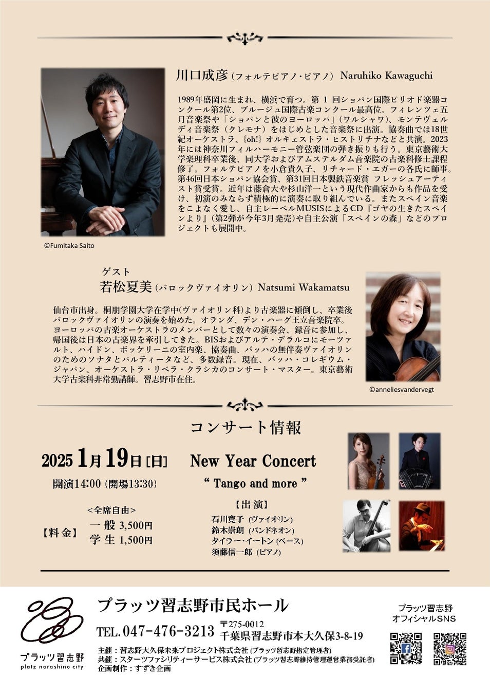 稀代のフォルテピアノ演奏家 川口成彦によるフォルテピアノリサイタルをプラッツ習志野市民ホールにて12月14日(土)に公演予定です。