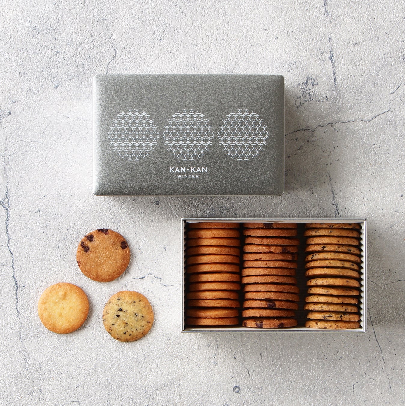 冬らしいスパイスとのかけ合わせを楽しめる3種のクッキー缶です。缶のデザインは、冬らしい雪の結晶をパターンで表現しました。塩気の効いたクッキーは、お酒が進む大人のおやつにぴったりです。