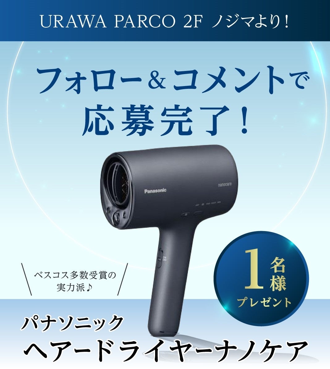 浦和PARCO公式Instagram(@parco_urawa_official)のフォローと該当の投稿へのコメントで「パナソニック ヘアードライヤー ナノケア」を抽選で1名様にプレゼントします。