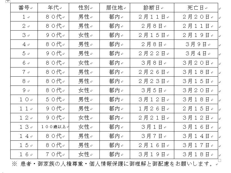 都内で新型コロナウイルスに感染した方が死亡されましたのでお知らせします。