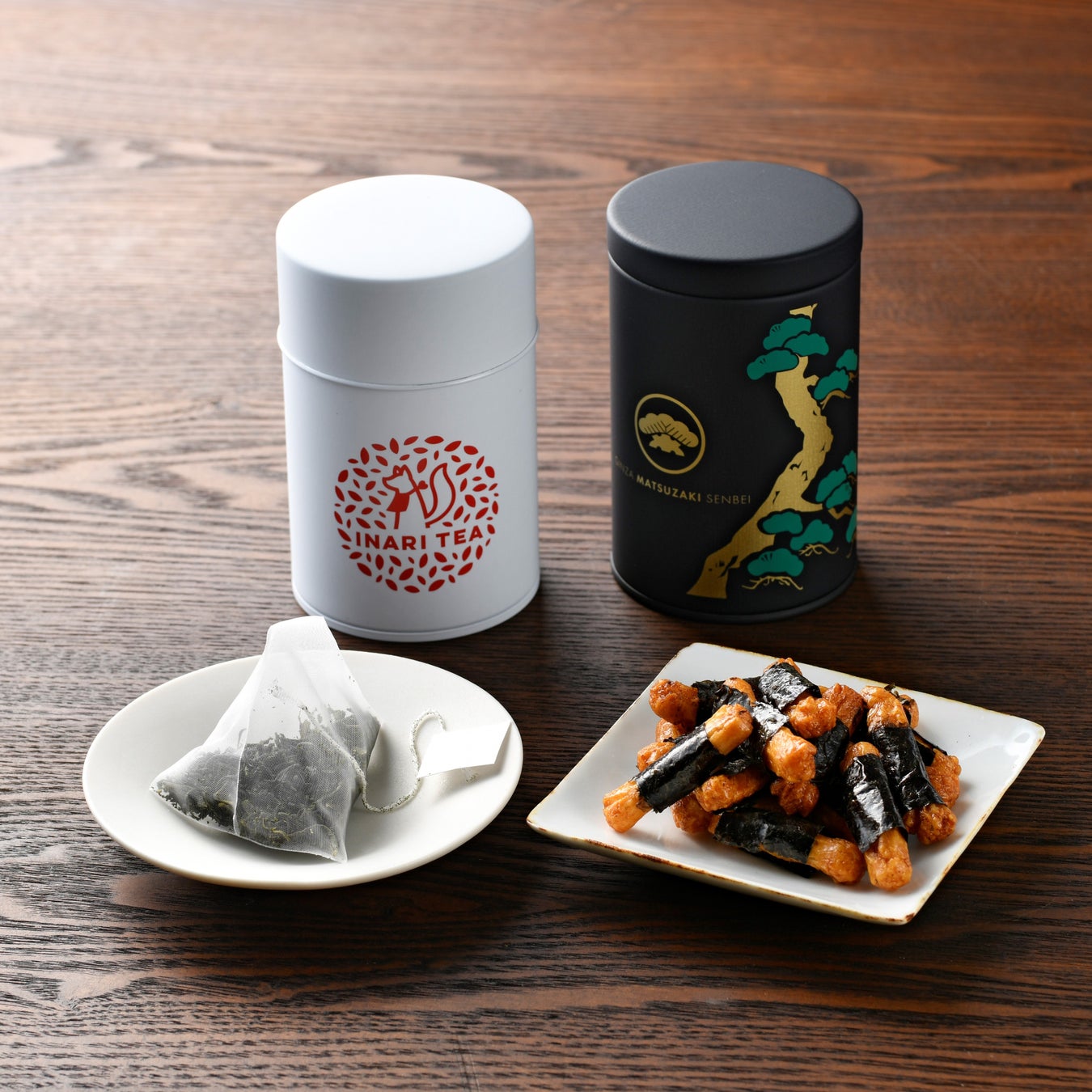 お醤油の味に負けないお米の風味が特徴の<銀座 松﨑煎餅>のあられと、<INARI TEA>ならではの、あられの風味が活きるように仕上げたアレンジティーのティーバッグをセットにしました。