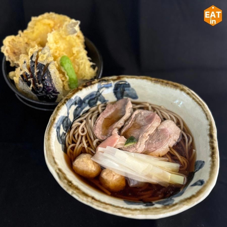 北海道産石臼挽きの蕎麦粉を二八で打ち上げた江戸前手打蕎麦を、同じ築地の鴨肉老舗<鳥上商店>の蔵王深山竹炭水鴨を使った「鴨南蛮」に仕上げました。築地ならではの新鮮素材のミニ天丼とのセットで提供。