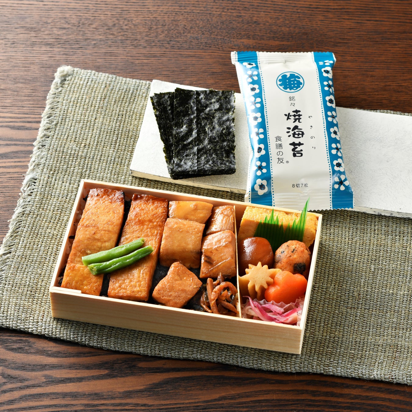 <山本海苔店>人気のもみ海苔「梅が香」をご飯の上にたっぷりまぶした海苔弁に、<日本橋弁松総本店>のめかじき削ぎ身の照焼とめかじき角煮をのせ、「梅が香」を練りこんだ揚げかまぼこ団子などもトッピング。さらに別添えで焼海苔もプラス。