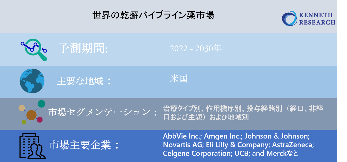 Kenneth Researchは調査レポート「世界の乾癬パイプライン薬市場:世界的な需要の分析及び機会展望2030年」を2022年01月 12日 に発刊しました。これは、詳細な市場の業界需要分析と市場の成長に影響を与えるさまざまな要因を提供します。レポートは、予測期間、市場価値、市場ボリューム、成長率、セグメント、市場プレーヤー、成長ドライバーを含む市場の成長を提供します。調査方法には、市場の評価と予測データの計算に基づく履歴データと現在のデータの収集が含まれます。このレポートのデータ収集には、一次調査と二次調査の両方が含まれます。
