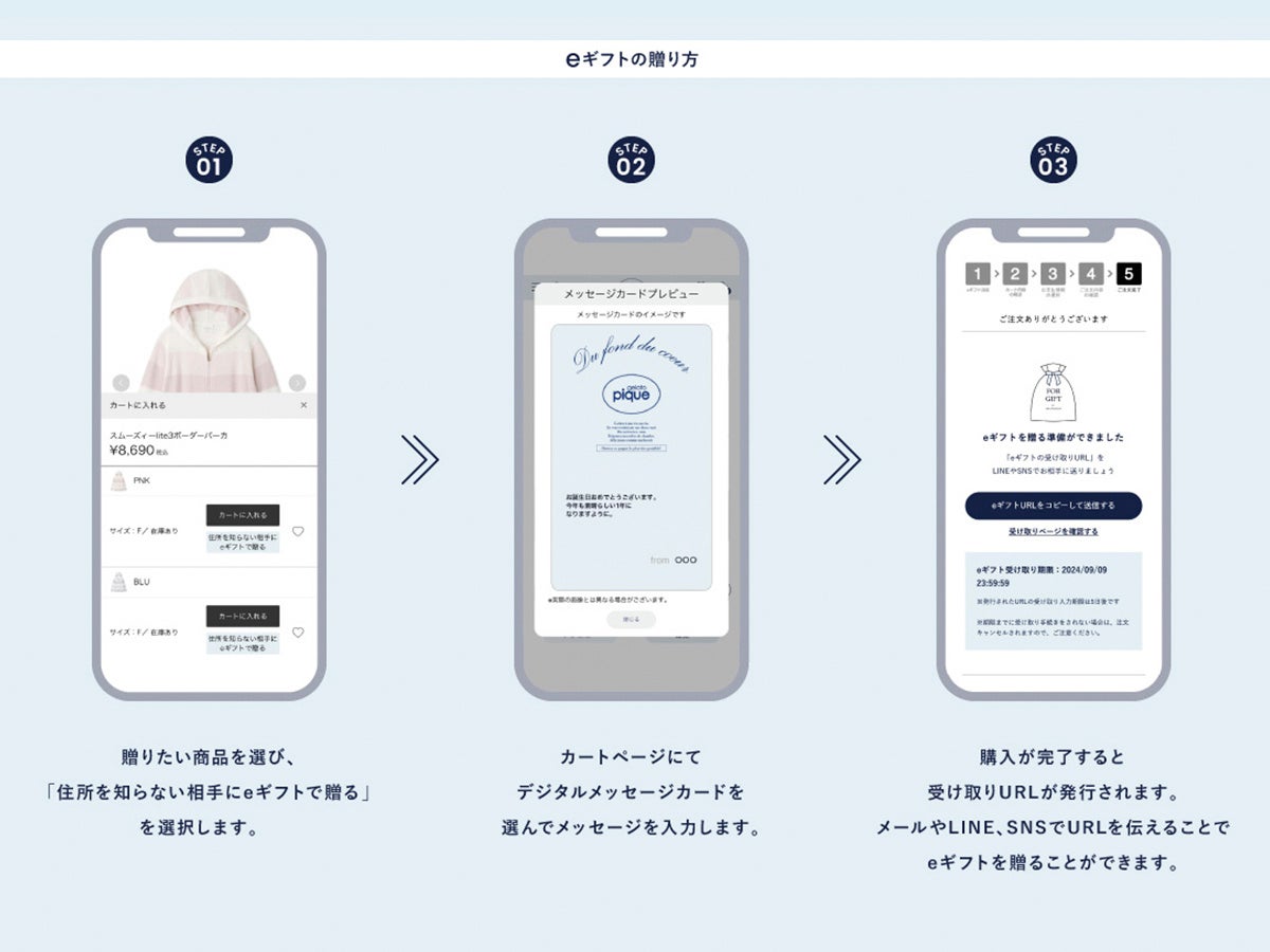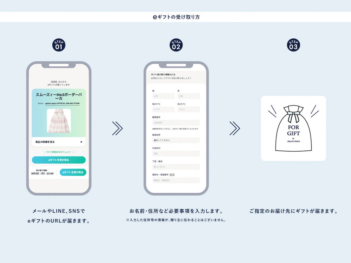 相手の住所がわからなくても誕生日や出産祝いのギフトを贈れる「eギフト」サービスを開始。ジェラート ピケのオリジナルデザインのデジタルメッセージカードで大切な人への気持ちもお届け。