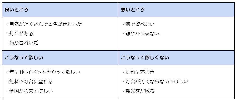 この後、一般社団法人tsumuguの小寺将太さんと青森大学むつキャンパスの学生4名で、模造紙に付箋を貼るスタイルで意見を出し合いました。子どもたちが考えたテーマは「良いところ」「悪いところ」「こうなって欲しい」「こうなって欲しくない」「尻屋埼灯台の利活用方法」の5つで、以下の意見が出ました。