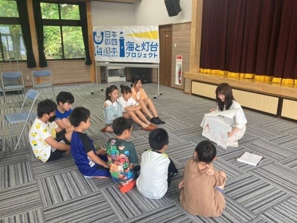 まずは、子どもたちに尻屋埼灯台について改めて知ってもらうところからスタート。紙芝居形式で、灯台がなぜ必要なのか、灯台の役割について話しました。初めて聞く灯台の話に、子どもたちは興味津々の様子。