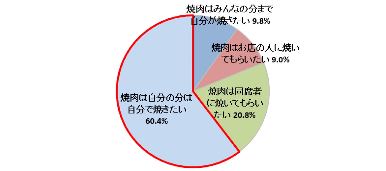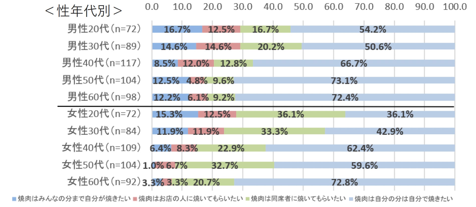 「焼肉に行くならどの方式?」という質問では、「個別注文派」が49.0%と半数近い結果に。また「自分で焼くか、焼いてもらうか」では、「自分の分は自分で焼きたい」が支持を集めました。性年代別では男性50代(73.1%)、60代(72.4%)が7割を超え、女性も40代(62.4%)、60代(72.8%)が高めという結果に。一方、「同席者に焼いてもらいたい」が最も高かったのは女性20代で36.1%でした。