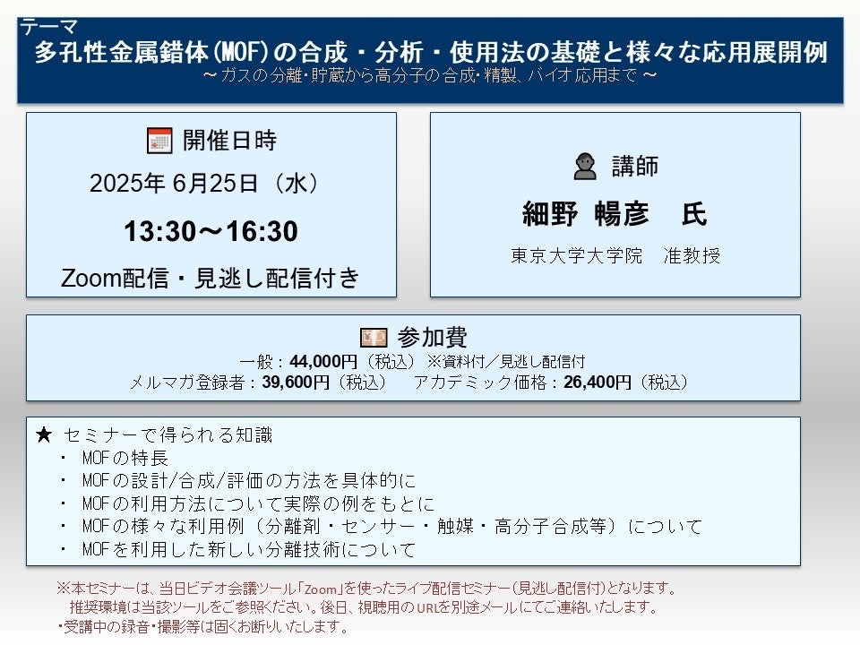 先端技術情報や市場情報を提供している(株)シーエムシー・リサーチ(千代田区神田錦町: https://cmcre.com/ )では、 各種材料・化学品などの市場動向・技術動向のセミナーや書籍発行を行っておりますが、 このたび「多孔性金属錯体(MOF)の合成・分析・使用法の基礎と様々な応用展開例~ ガスの分離・貯蔵から高分子の合成・精製、バイオ応用まで ~」と題するセミナーを、 講師に細野 暢彦 氏 氏(東京大学大学院 准教授)をお迎えし、2025年6月25日(水)13:30より、 ZOOMを利用したライブ配信(見逃し配信付き)で開催いたします。 受講料は、 一般:44,000円(税込)、 弊社メルマガ会員:39,600円(税込)、 アカデミック価格は26,400円(税込)となっております(資料付)。