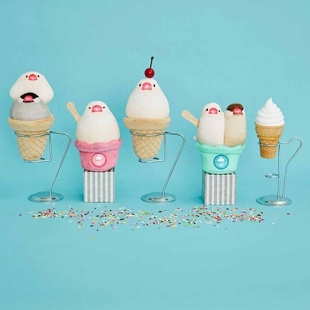 白文鳥がコーンやカップにみっしり収まってソフトクリームに変身した姿が楽しめるポーチです。