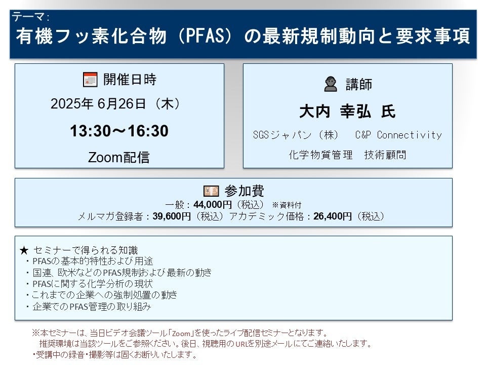 先端技術情報や市場情報を提供している(株)シーエムシー・リサーチ(千代田区神田錦町: https://cmcre.com/ )では、 各種材料・化学品などの市場動向・技術動向のセミナーや書籍発行を行っておりますが、 このたび「有機フッ素化合物(PFAS)の最新規制動向と要求事項」と題するセミナーを、 講師に大内 幸弘 氏(SGSジャパン(株)C&P Connectivity 化学物質管理 技術顧問)をお迎えし、2025年6月26日(木)13:30より、 ZOOMを利用したライブ配信(見逃し配信付き)で開催いたします。 受講料は、 一般:44,000円(税込)、 弊社メルマガ会員:39,600円(税込)、 アカデミック価格は26,400円(税込)となっております(資料付)。