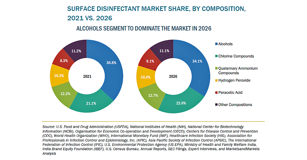 表面消毒剤の市場規模は、2021年の29億米ドルからCAGR8.4%で成長し、2026年には43億米ドルに達すると予測されています。市場成長の要因は、表面消毒剤の使用に対する厳しい規制の増加と、新しい表面消毒剤を使った除菌の増加です。