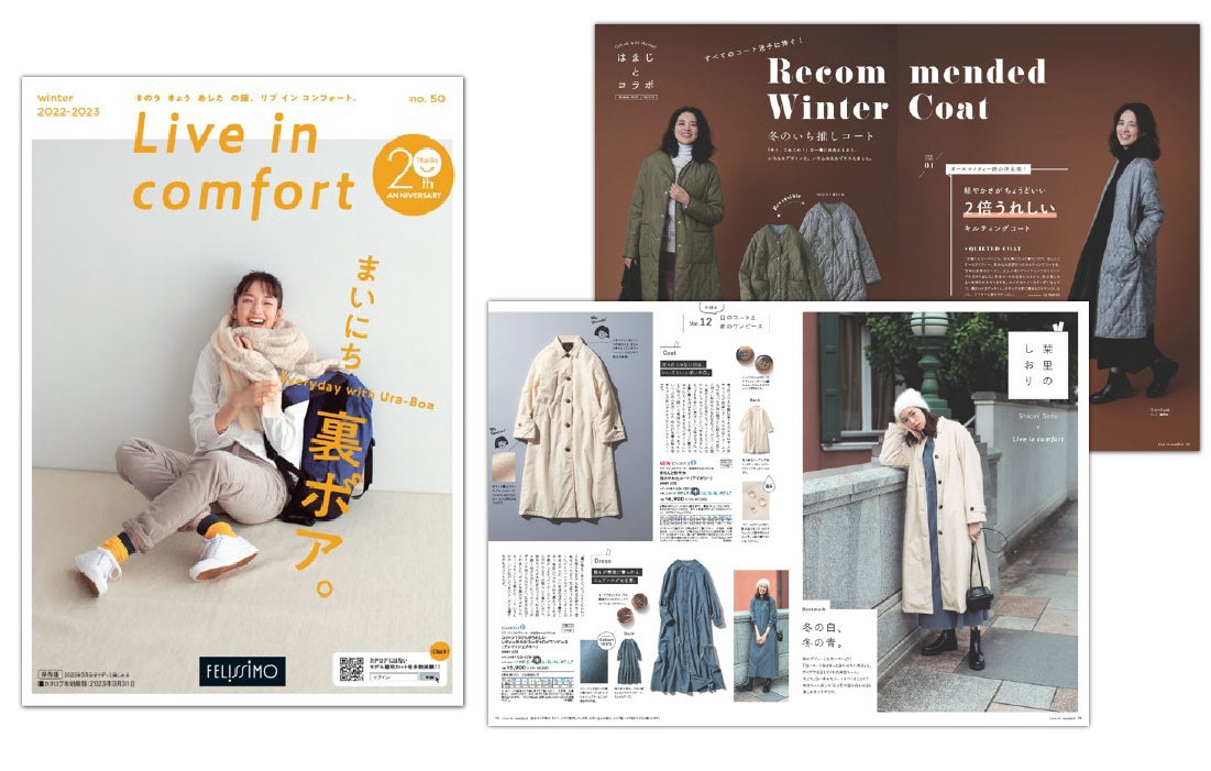 「きちんと軽やか撥水中わたコート」「エコファー遣いのサイドゴアブーツ」など佐藤栞里さん、浜島直子さんとコラボした新作がフェリシモ「Live in comfort[リブ イン コンフォート]」から登場