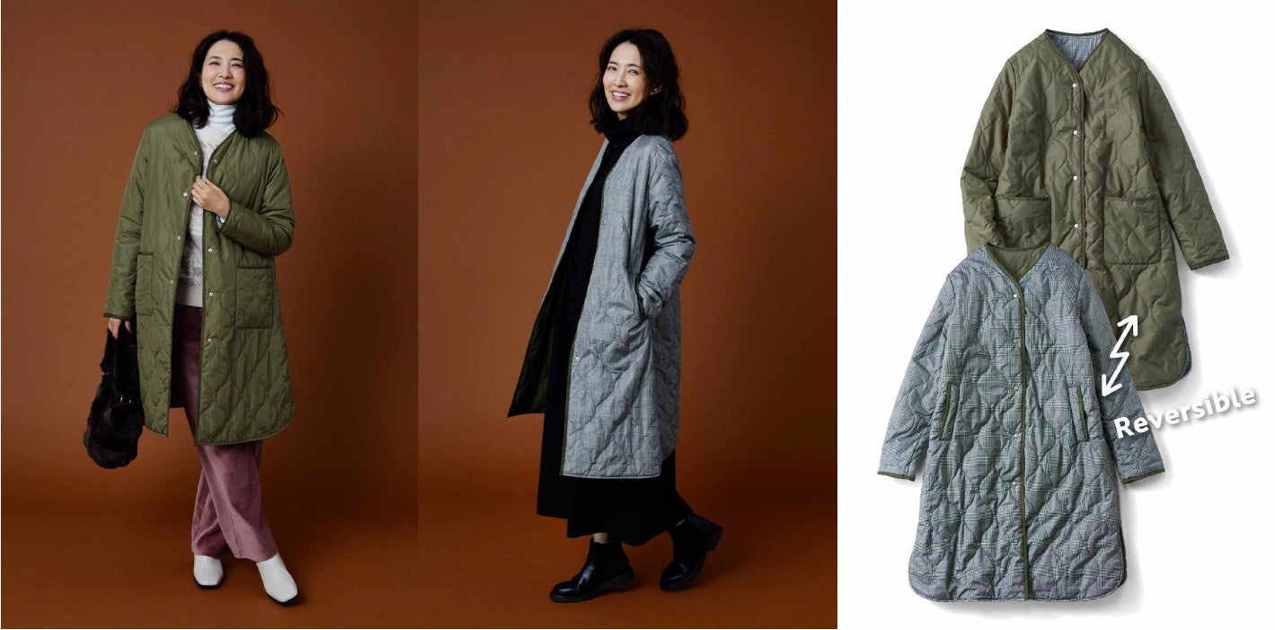 デイリーカジュアルなコーデにぴったりのカーキと、ナチュラルだけどきれい見えするグレンチェックのリバーシブルのキルティングコートです。きれいめに見せたいときも、公園やちょっとそこまでふだん遣いしたいときにも一枚で決まります。ポケット内はフリース、着ぶくれしない量の中わたですっきりなAラインシルエットなのに暖かです。