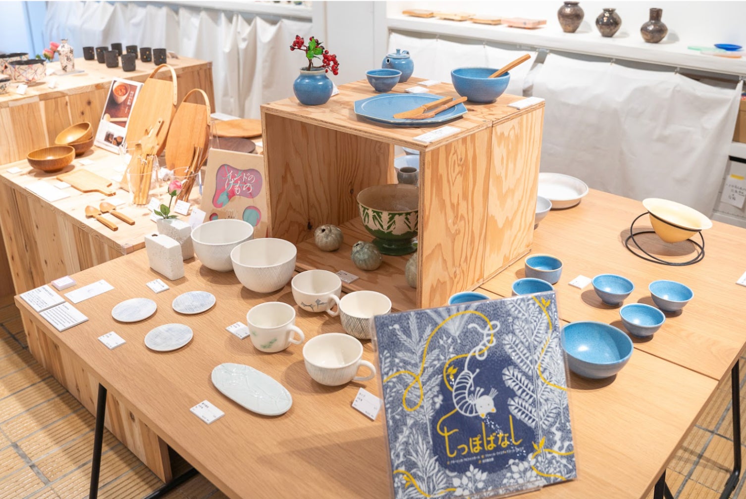 店舗内には、器やアクセサリーなど生活に寄り添うアートを中心とした常設作品コーナー「LIFE WITH ART」、企画展と連動した書棚も設置。店舗の営業時間中は、屋外のキッチンカー「NoM cafe」のカフェドリンクで、一息つくこともできます。